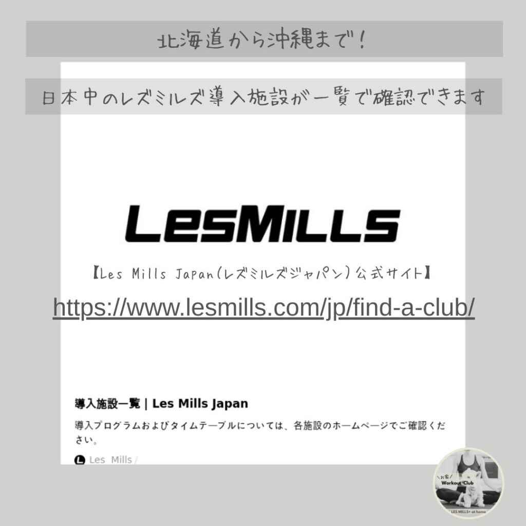 【Les Mills Japan(レズミルズジャパン)公式サイト】では、日本中のレズミルズ導入施設が一覧で確認できます。